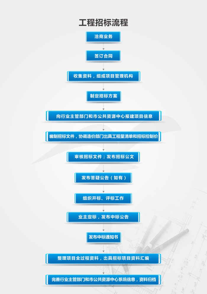 屋建筑和市政基础设施工程、水利水电工程、交通道路工程、土地整理和政府采购等项目施工、监理、勘察、设计、设备采购等招标代理工作。