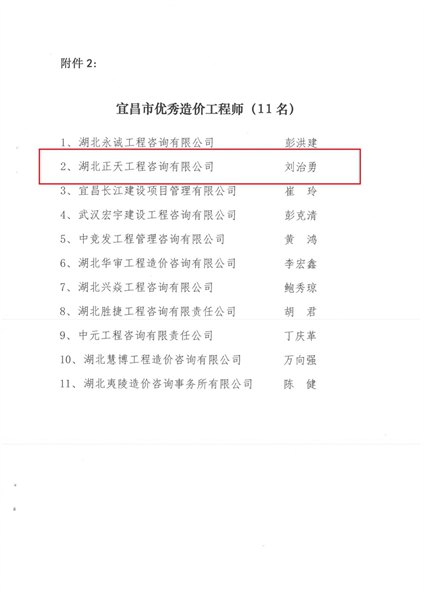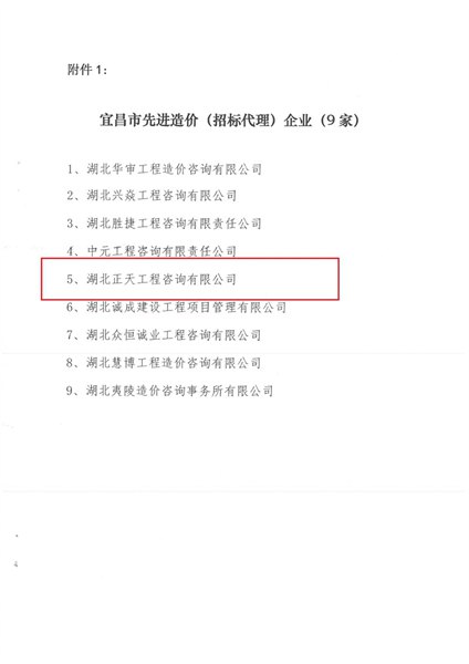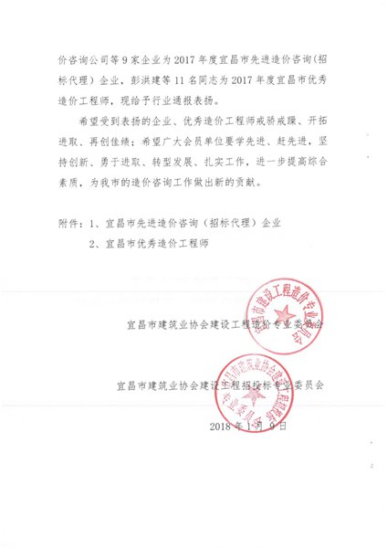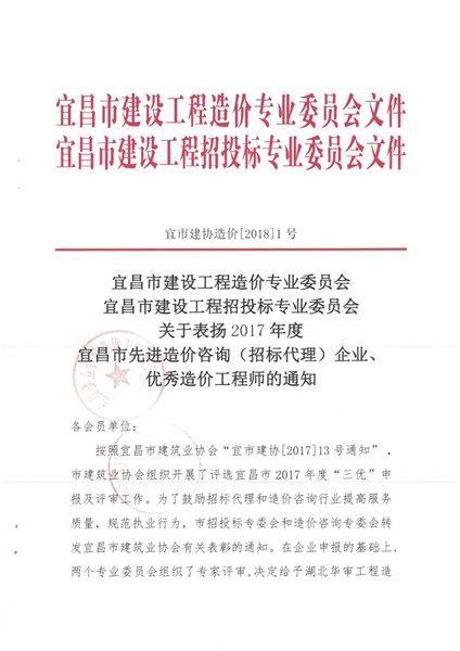 2017年度宜昌市先进造价咨询(招标代理)企业、优秀造价工程师